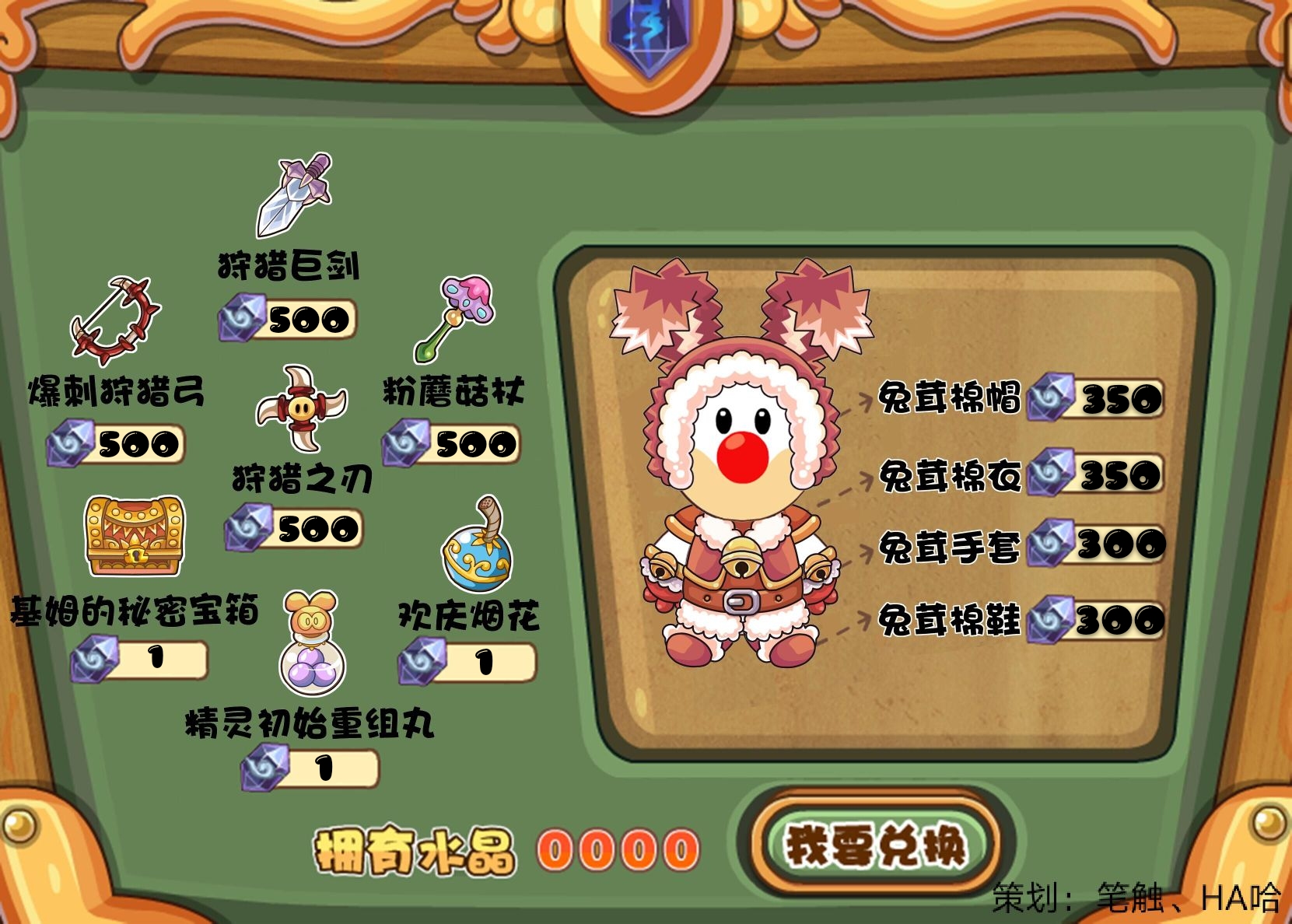 公告:2020年12月18日凌晨重启服务器后,勇士广场NPC多修的魔力水晶兑换将会调整(由于前端暂时无法修改,因此请对照下表的相应部位进行兑换),前端物品扣除和数量显示会有问题,但后台逻辑是按照下图中的物品和数量进行扣除的。兔茸四件套的属性进行了加强,兔茸棉帽:防御+250,抗魔+50,速度+20,回避+3,精神+20,最大生命+10,最大魔力+15;兔茸棉衣:魔攻+60,防御+300,抗魔+60,回避+5,精神+30,最大生命+50,最大魔力+100;兔茸手套:防御+100,抗魔+50,回避+3,精神+30,最大生命+20,最大魔力+20;兔茸棉鞋:防御+100,抗魔+50,速度+80,回避+8,精神+40,最大生命+10,最大魔力+10;另外,兔茸四件套暗藏套装属性:防御+250,速度+30,回避+25,精神+100,恢复力+30,最大生命+110,最大魔力+90。本次活动由笔触、HA哈策划。